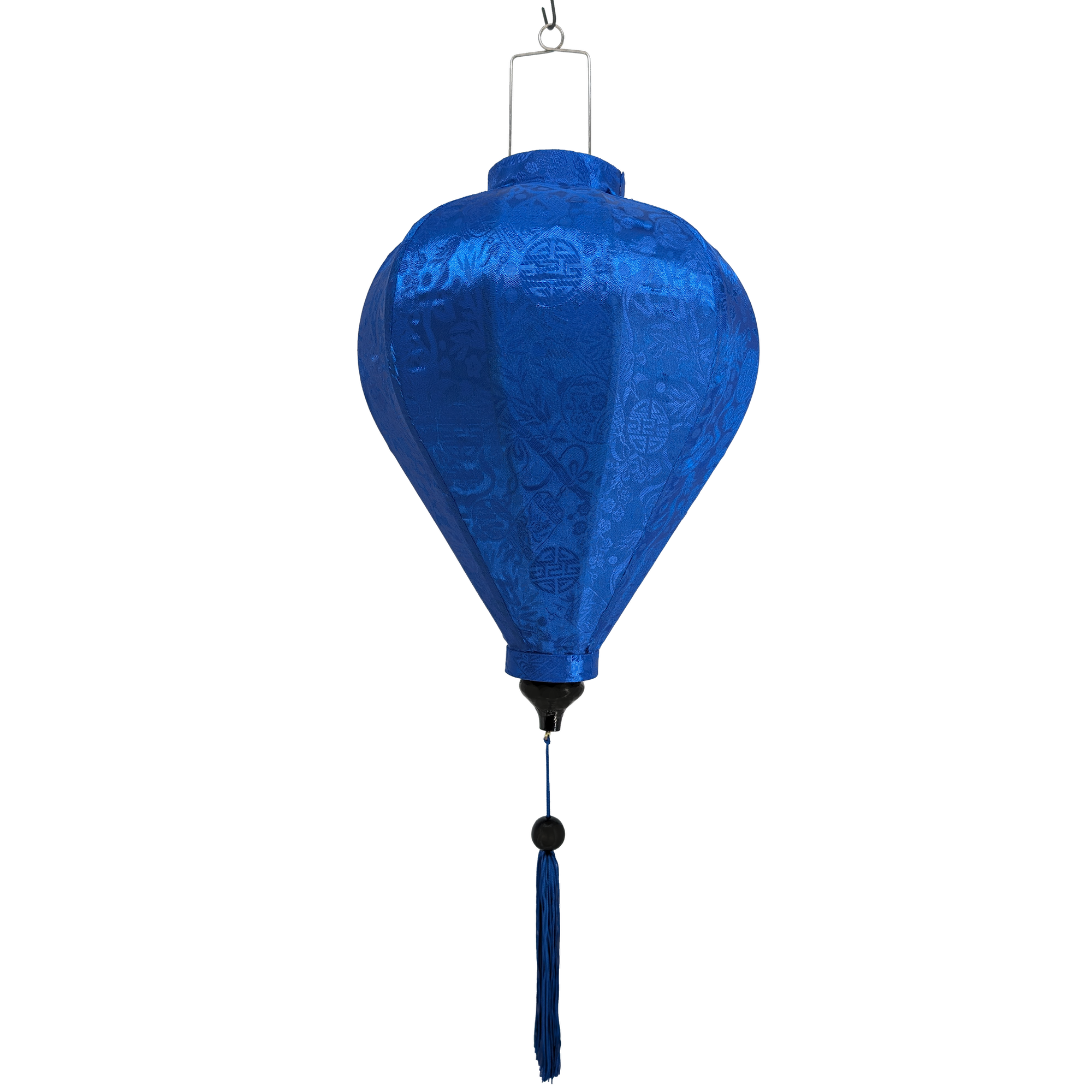Jacquard silk Hoi An Lanterns are made with a blend of silk and nylon. This dark blue colour is a great way to add life to any corner. Due to the thickness of the fabric we recommend lighting them from the outside as you will see the bulb when lit from the inside.  When lit from the outside you can see the patterns and various shades in the light.