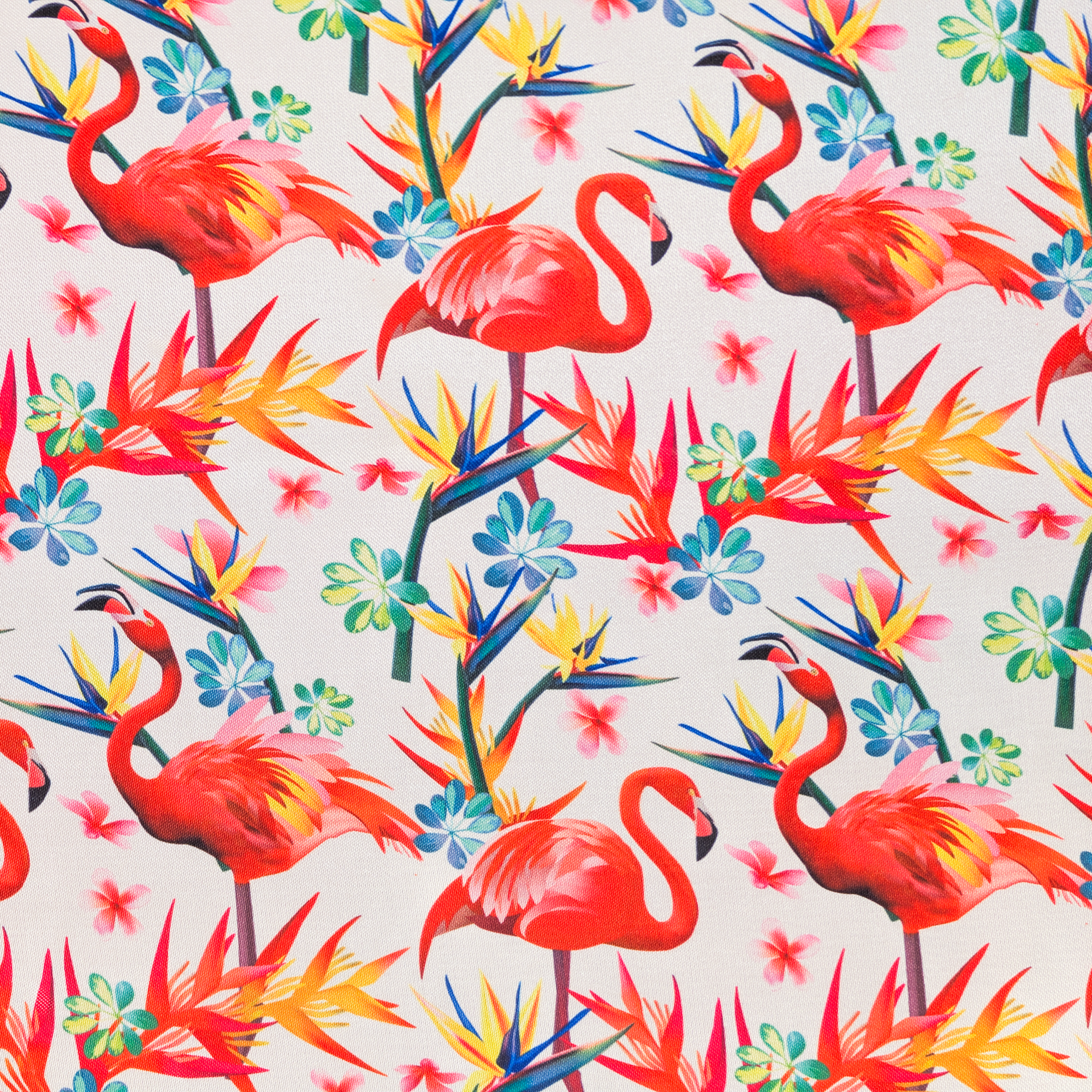 These handmade Vietnamese Silk Lanterns are the perfect way to add exotic flair to your garden or outdoor spaces. The lanterns feature a print of flamingos and bird of paradise flowers on a white background, creating a bold and eye-catching design.