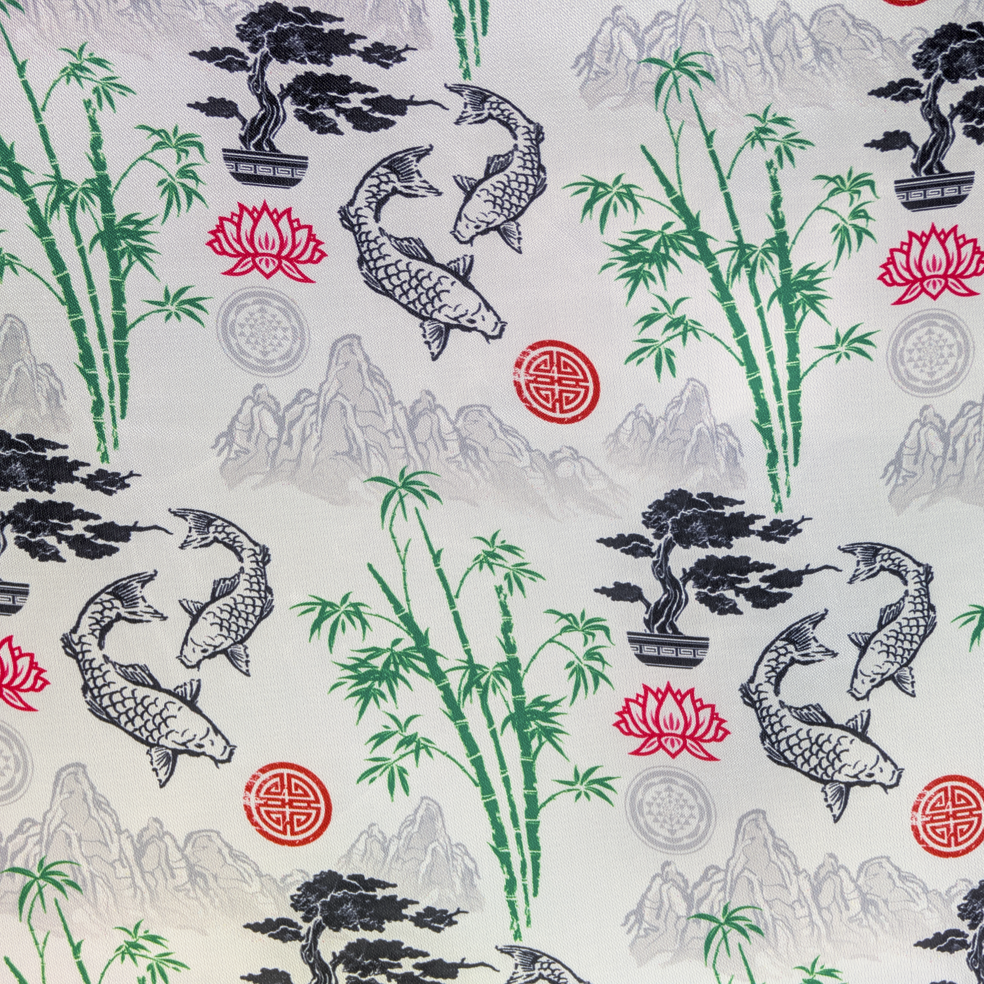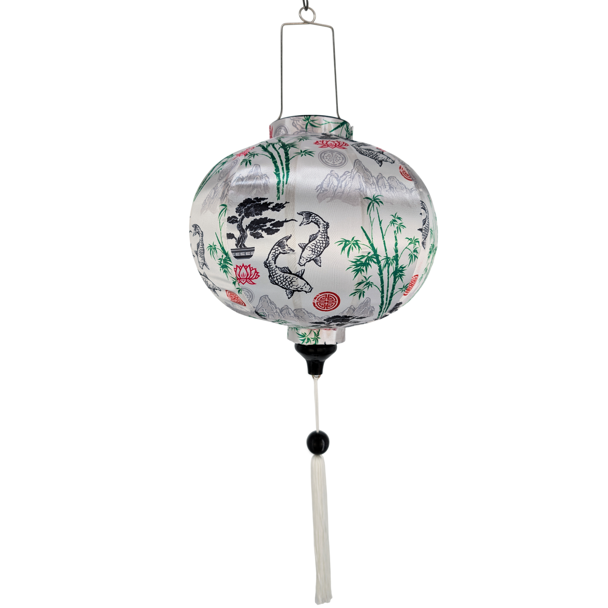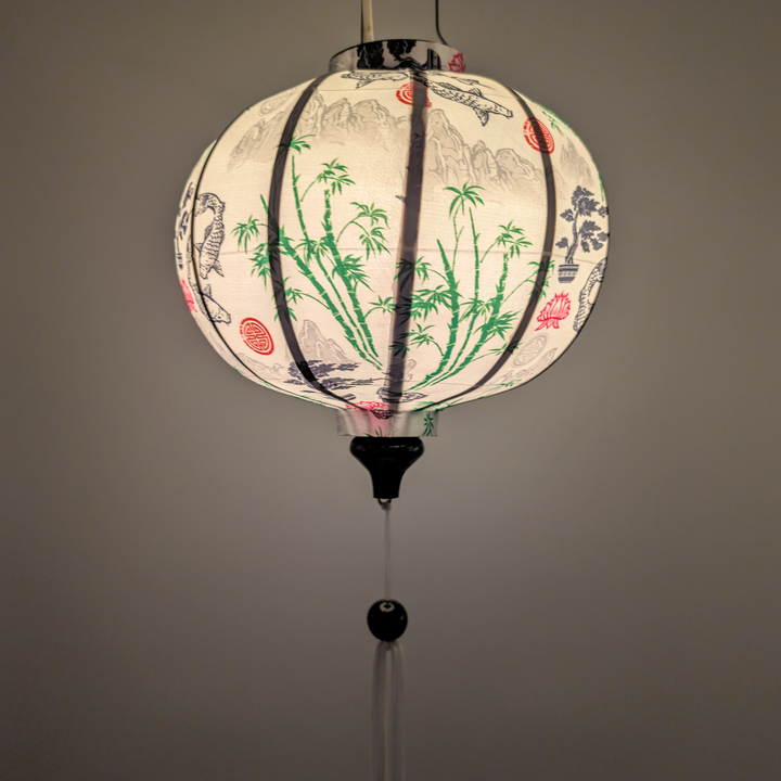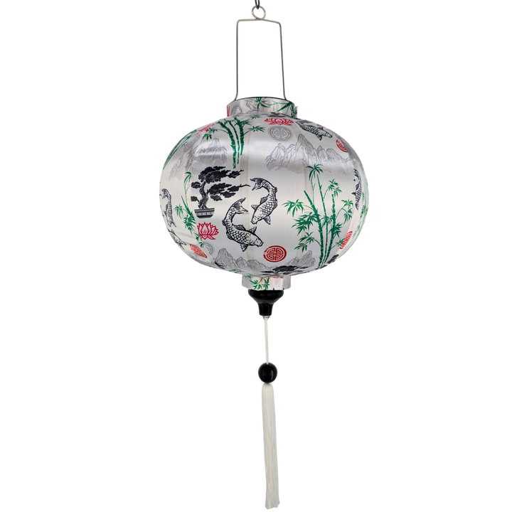 This intricate handmade Vietnamese Silk Lantern crafted in Hoi An from bamboo and fabric features a captivating illustration of mountains, bamboo trees, black koi fish swimming amongst red lotus motifs on a white backdrop. The perfect addition to any office or bedroom, this item makes an ideal gift for someone special.