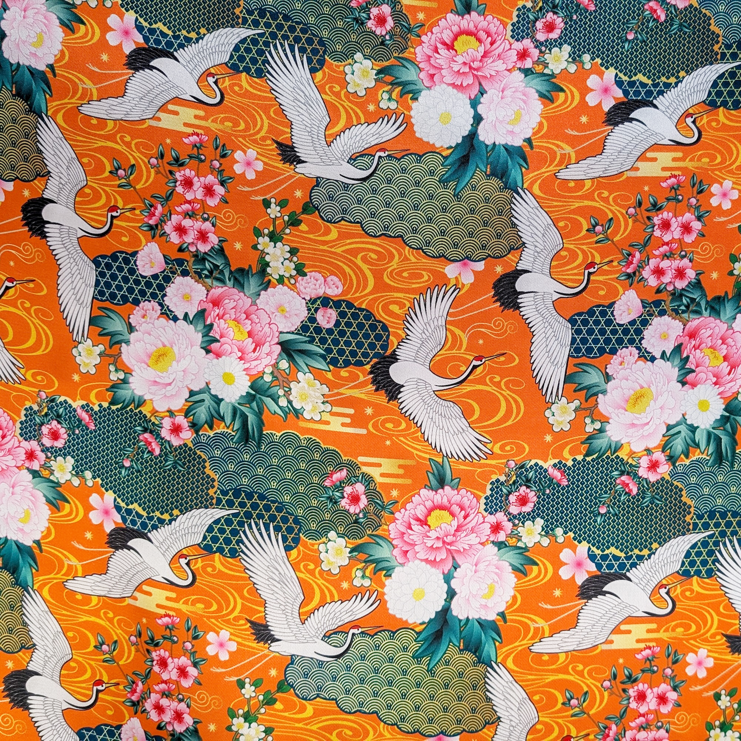 This Vietnamese silk lantern from Hoi An features a print of white cranes flying amidst a orange background of geometric shapes, flowers, and golden clouds. This intricate design is sure to add the extra wow factor to any room in your home.