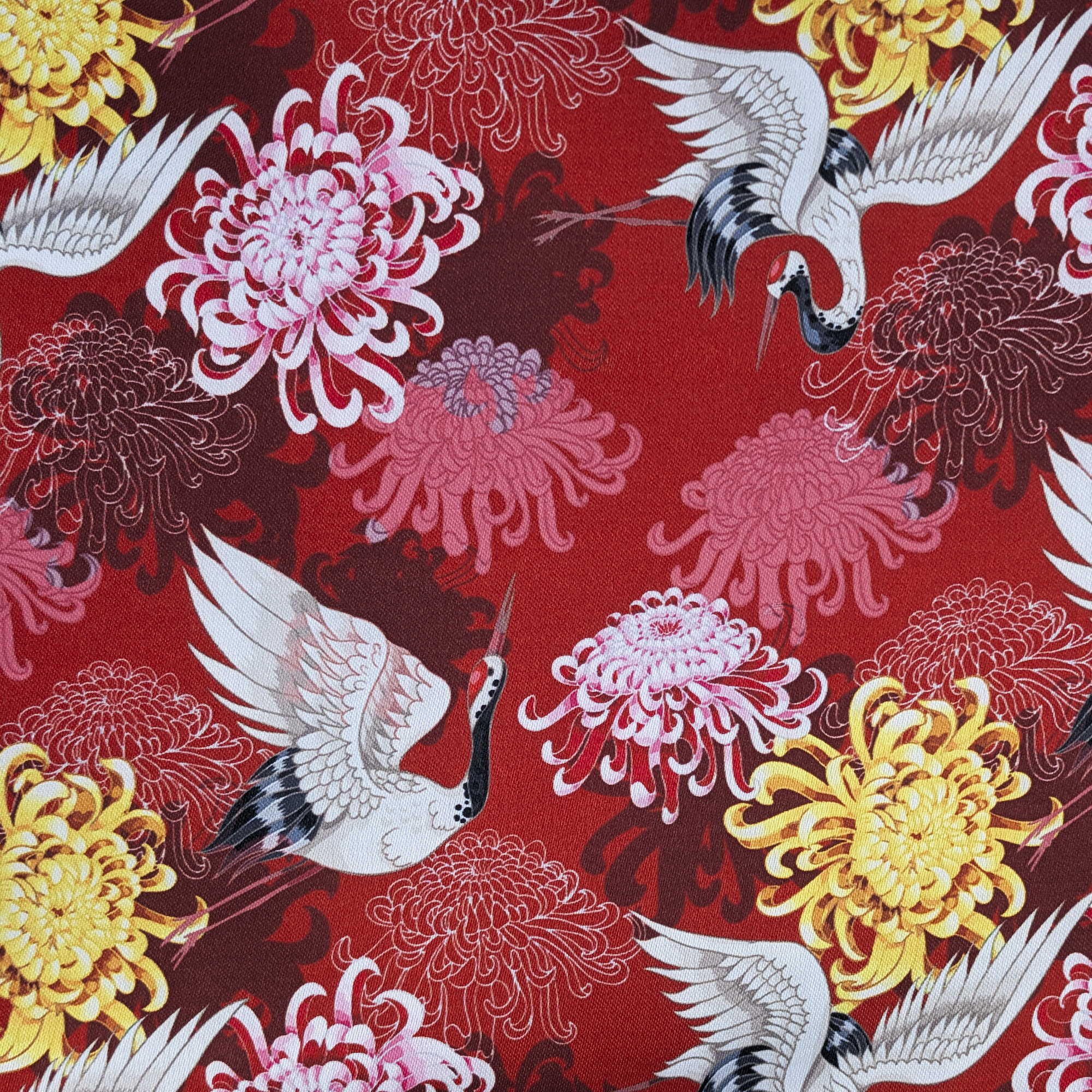 This polyester silk fabric print is truly breathtaking, featuring mauve, purple, pink and yellow chrysanthemum flowers with black and white cranes in flight against red backdrop. Order now, while stock lasts.
