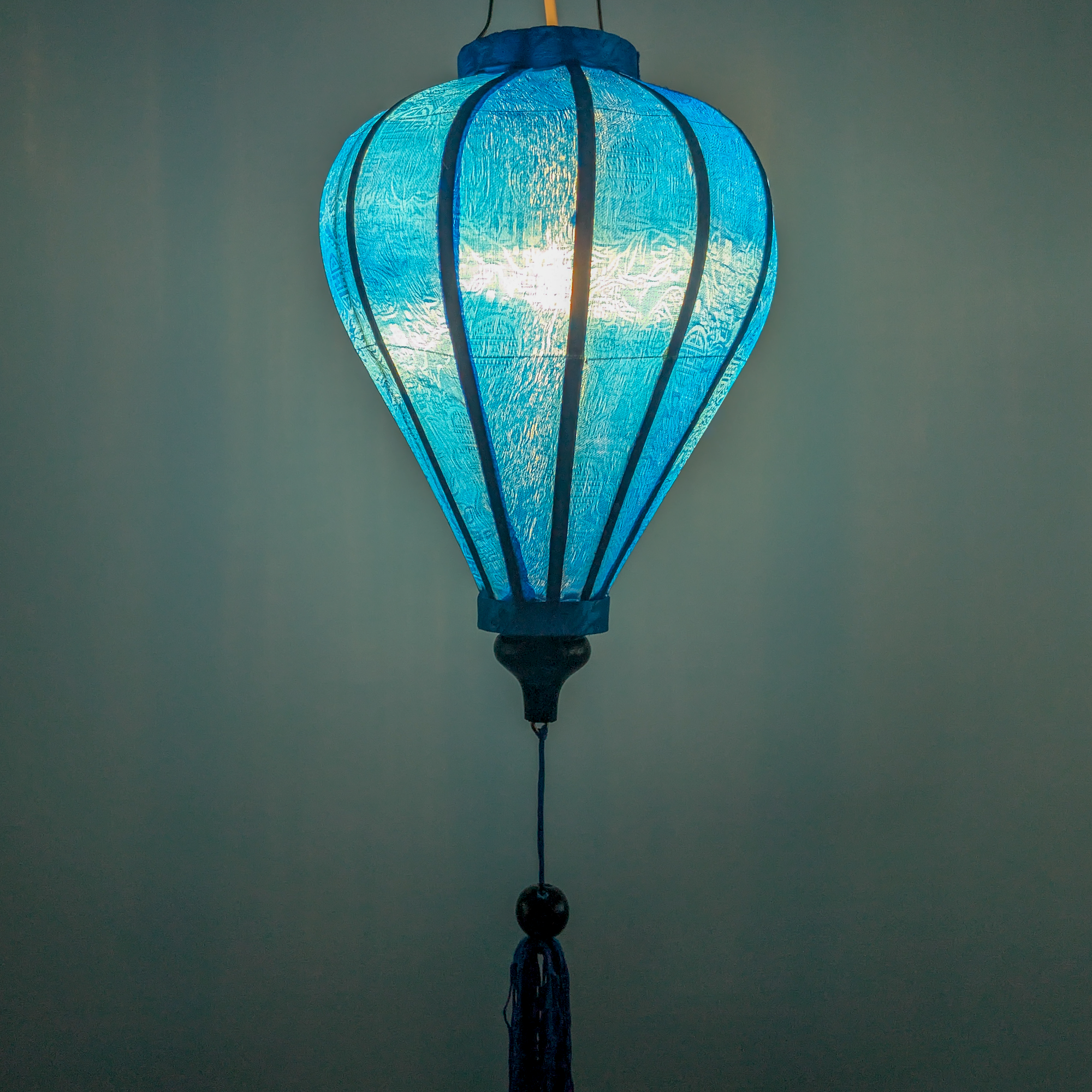 자카드 실크 호이안 랜턴은 진짜 실크로 만들어졌습니다. 이 파란색은 모든 구석에 생기를 더하는 좋은 방법입니다. 원단이 두껍기 때문에 안쪽에서 불을 켜면 전구가 보이기 때문에 바깥쪽에서 불을 켜는 것이 좋습니다. 바깥쪽에서 불을 켜면 빛 속의 패턴과 다양한 색조를 볼 수 있습니다.