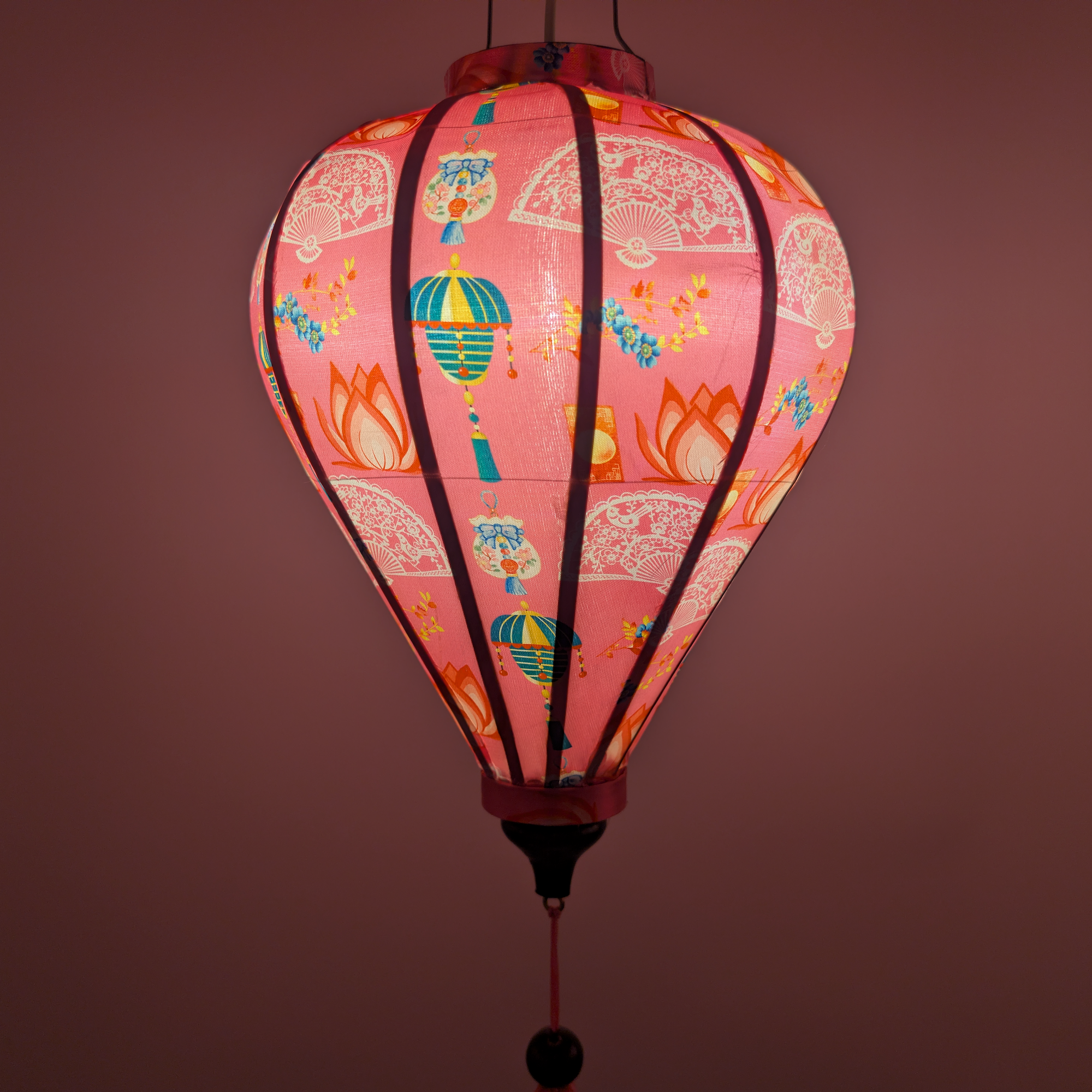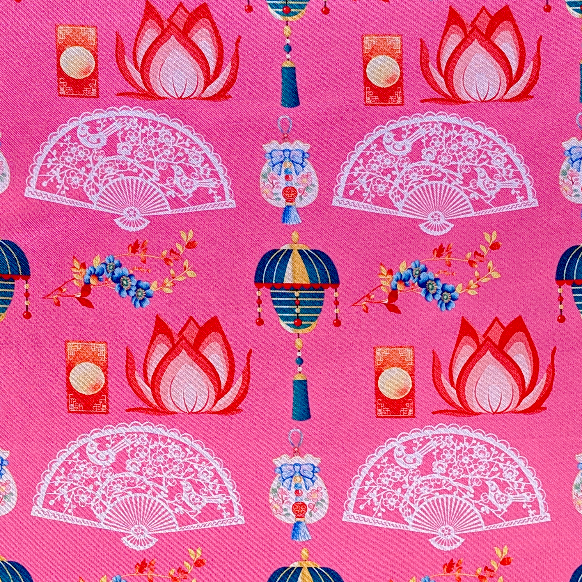 Looking for something unique? This striking print features elegant red lotus flowers, intricate white fans, and futuristic lanterns accented with blue blossoms set against a vibrant pink background. Perfect for brightening up a balcony, adding a pink glow to a bedroom, or gifting to someone special.