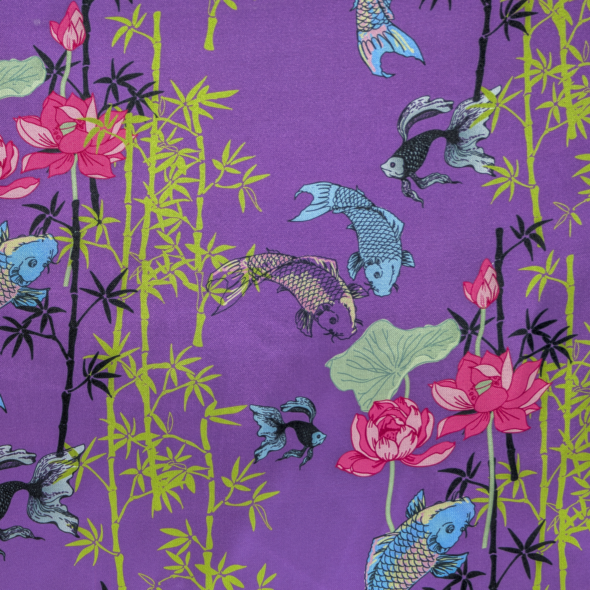 보라색 배경에 대나무 갈대와 분홍색 연꽃을 헤엄치는 잉어 그림이 그려진 베트남 실크 등불입니다. 호이안 랜턴은 집안 인테리어에 문화와 자연의 감성을 더하는 아름답고 독특한 방법입니다. 오렌지색도 있습니다.