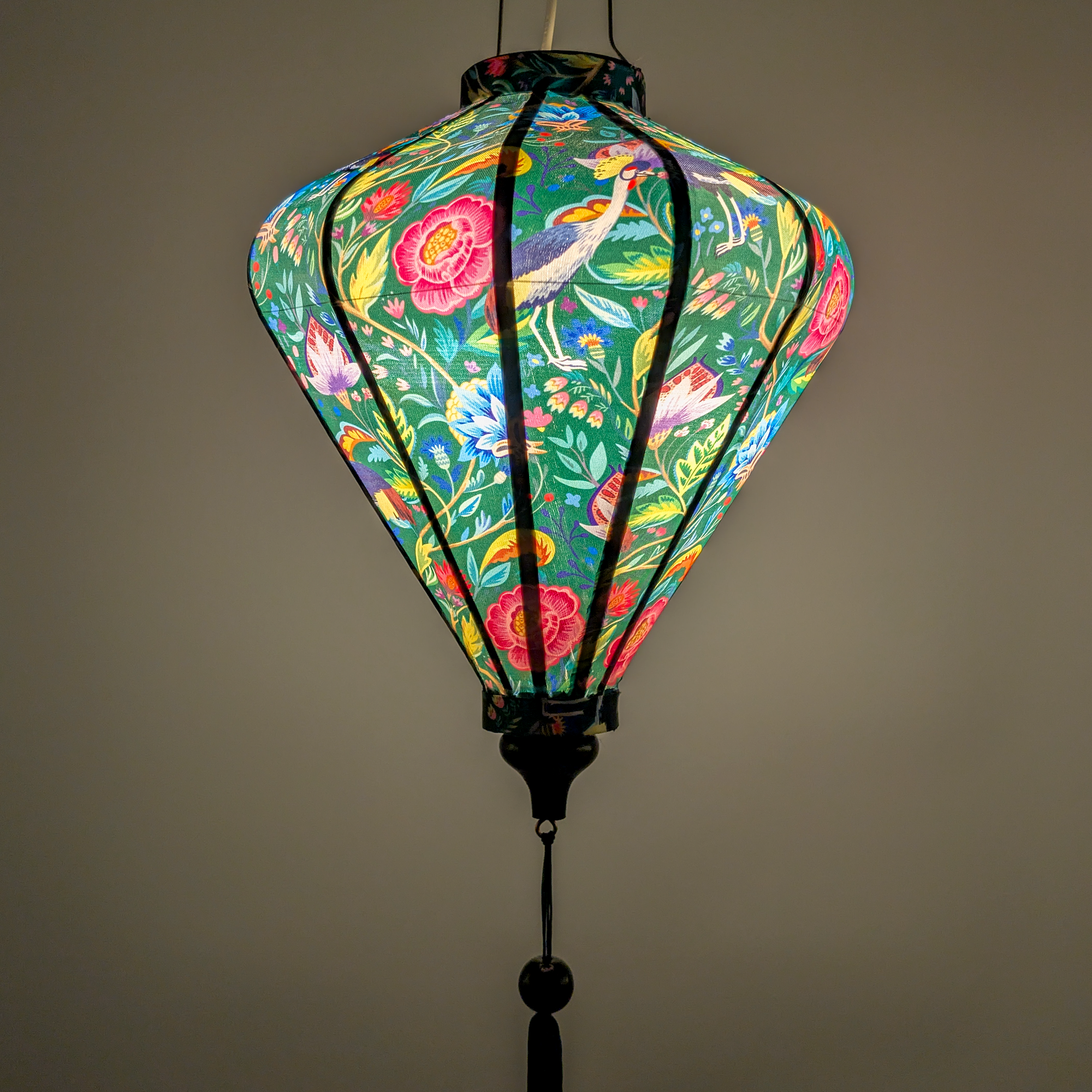 호이안에서 직접 제작한 베트남 실크 랜턴은 짙은 녹색 원단에 풍성하고 열대적인 디자인이 프린트되어 있습니다. 분홍색, 보라색, 파란색의 생동감 넘치는 큰 꽃들 사이에 위풍당당한 왕관을 쓴 두루미가 그려진 패턴입니다. 녹색 배경에 선명한 분홍색, 파란색, 노란색, 파란색의 조화가 어우러져 대담하고 고급스러운 분위기를 자아냅니다. 이 패턴은 집 인테리어에 멋진 포인트를 더할 것입니다.
