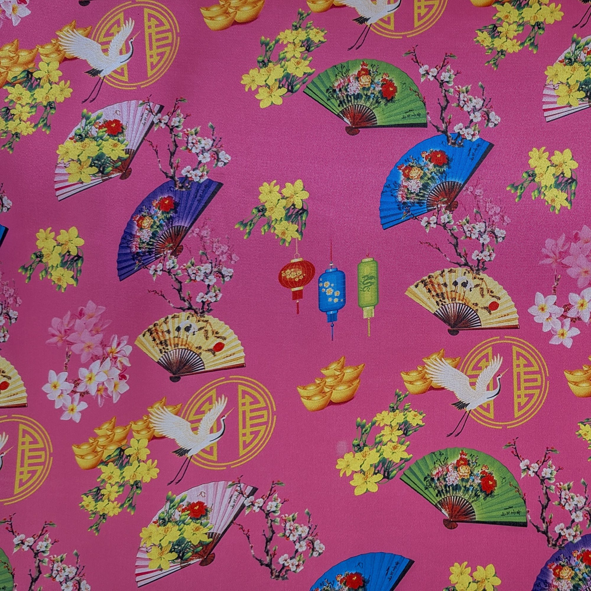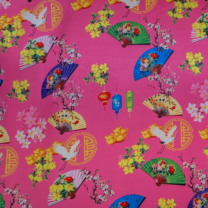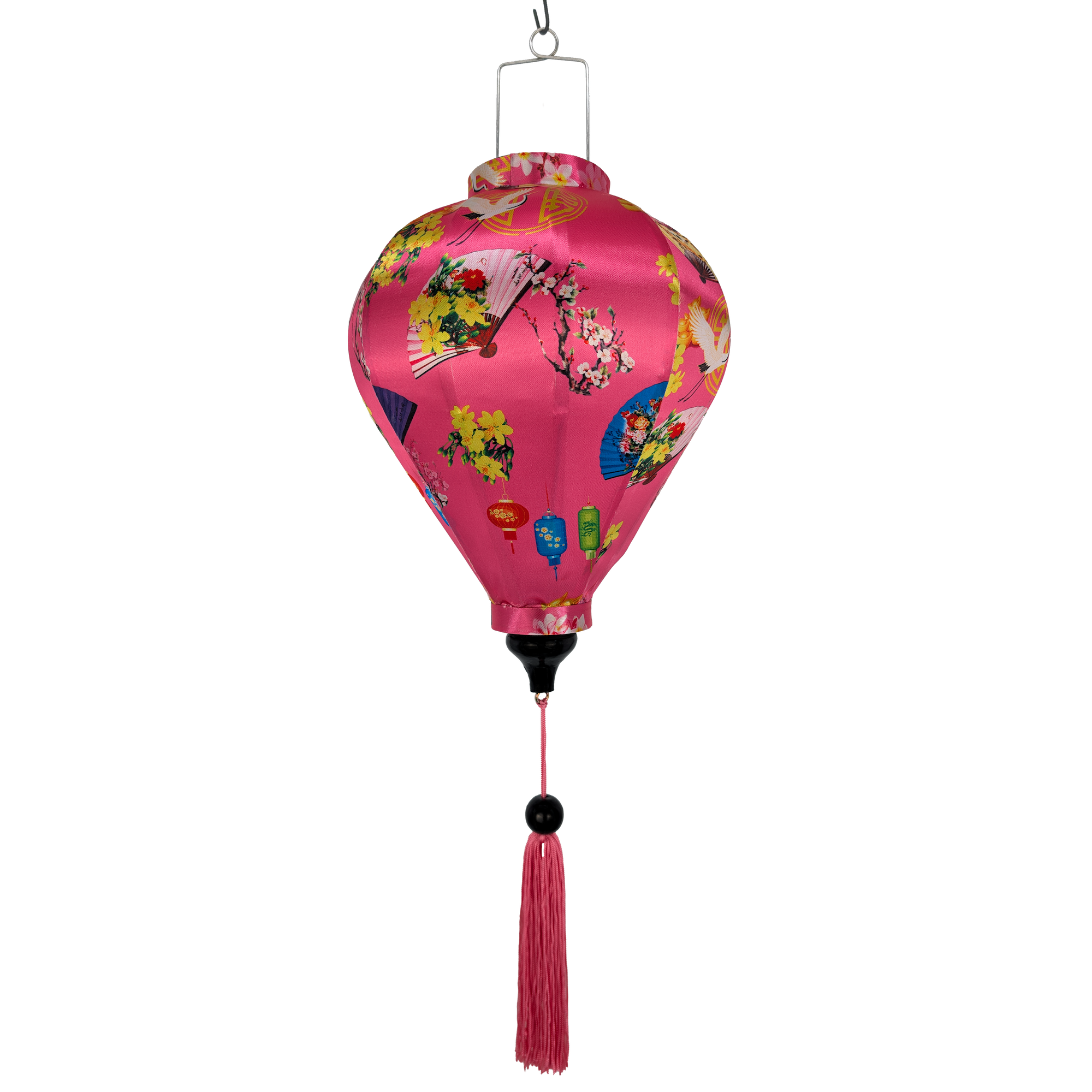 This silk lantern has a joyful spring festival design on a pink background showcasing a mix of colourful folding fans adorned with floral motifs, cranes in flight and blossoming branches that evoke the beauty of spring. Accents of gold ingots, lanterns, and yellow flowers add a festive vibe. Perfect for creating lanterns that glow with warmth and carry the spirit of celebration, luck, and new beginnings.