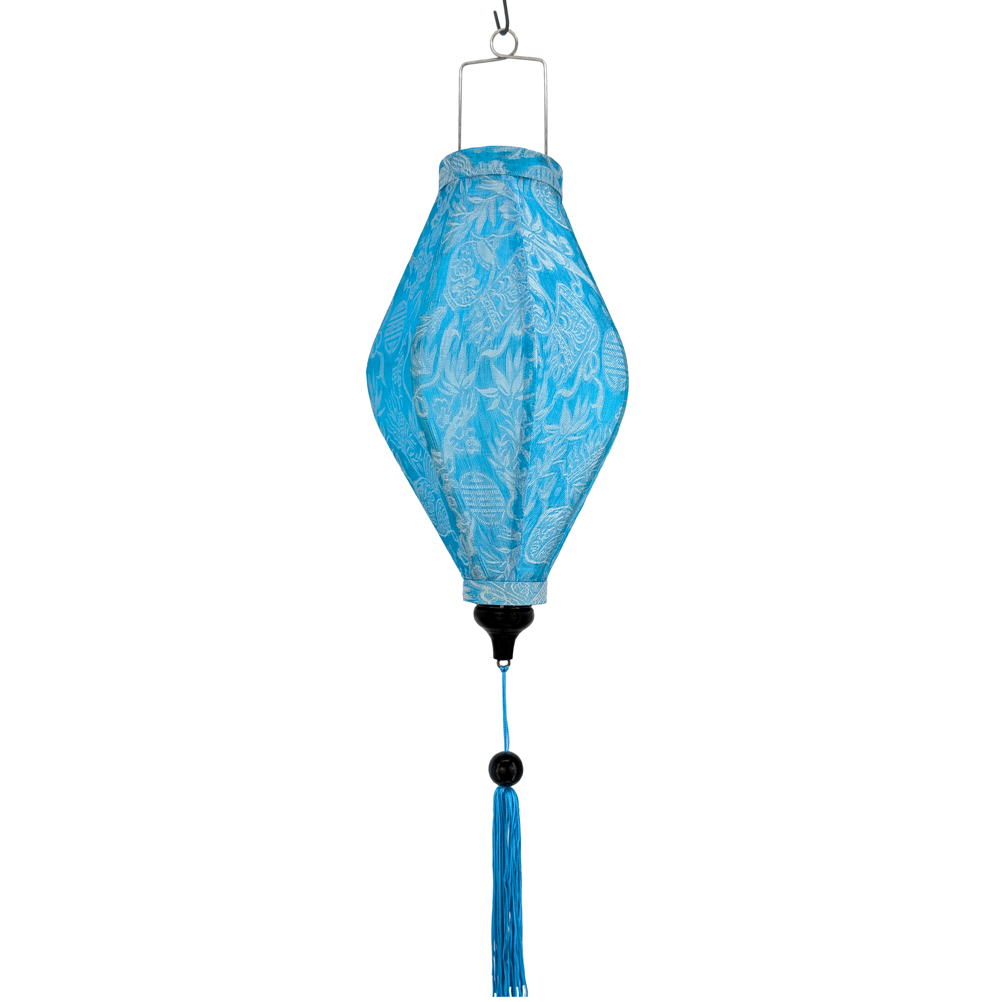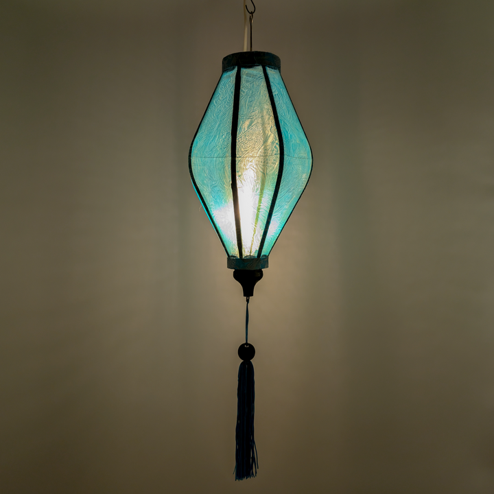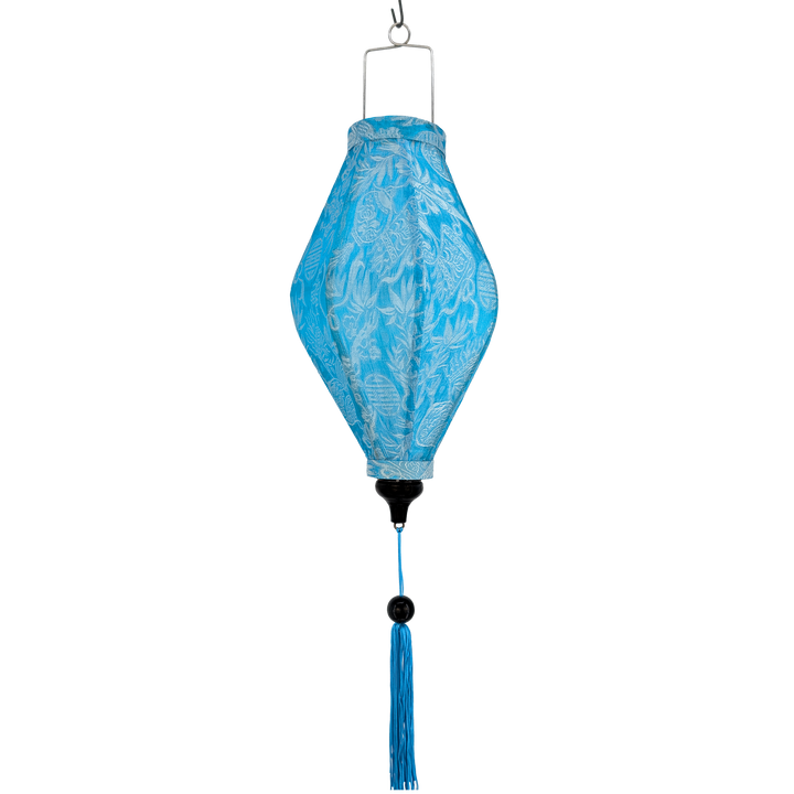 This Light Blue & Silver Jacquard silk fabric creates a gorgeous shimmer. Due to the thickness of the fabric we recommend lighting them from the outside as you will see the bulb when lit from the inside.  Add movement and light the lantern from the outside to see the patterns shimmer and colours shine.