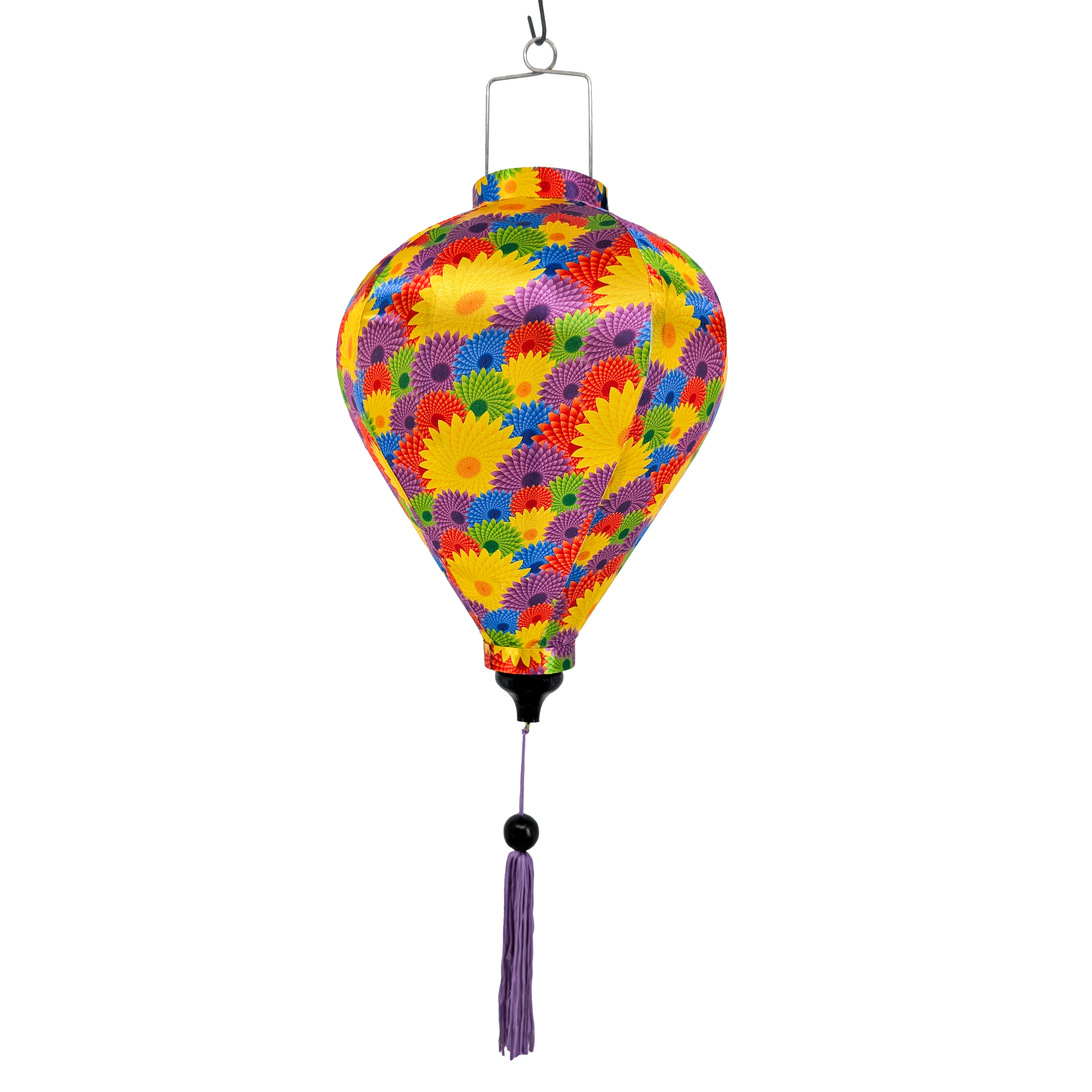 This handmade Vietnamese bamboo lantern has an unusually striking print showcasing fractal flowers in a rainbow palette. Large yellow blooms with layers of purple, blue, green, red, and orange fractal petals. Perfect for bold statement pieces, retro-inspired projects, or anyone who loves playful, eye-catching patterns.