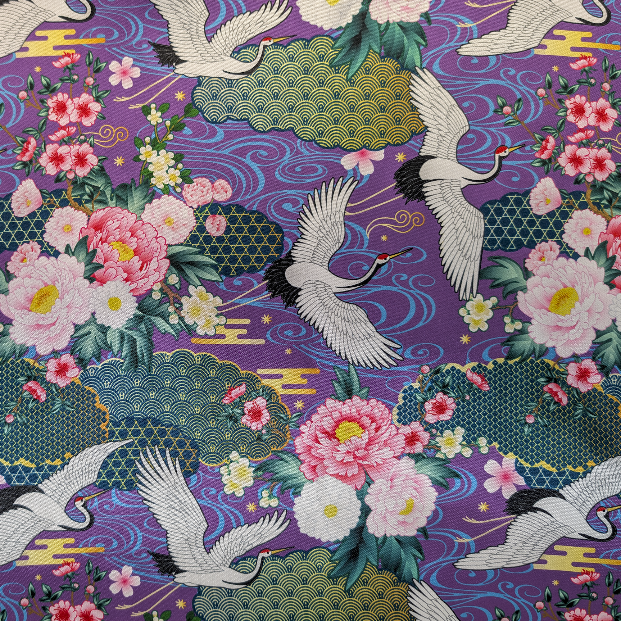 A new colour of this popular print has just been released! Featuring black and white cranes flying amidst a purple background with blue swirls, geometric shapes, flowers, and golden clouds. This intricate design makes a special gift!
